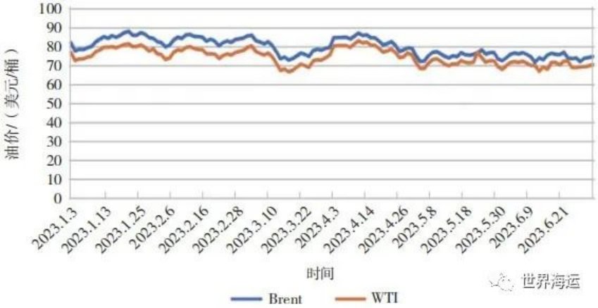 2023年上半年全球油輪運輸市場全面復(fù)蘇,各船型代表航線日收益均呈現(xiàn)不同程度的漲幅,原油輪整體上漲幅度好于成品油輪。需求方面,2023年上半年全球海運貿(mào)易和需求比2022年略有增長,且基本恢復(fù)到2019年疫情前水平;供給方面,新船交付、新船訂單均處于歷史低點,拆船量不及預(yù)期,油船運力增速放緩,處于歷史低點。國際原油價格圍繞全球經(jīng)濟前景、庫存、美聯(lián)儲貨幣政策等因素保持區(qū)間震蕩,2023年1—6月Brent、WTI均價分別為79.9美元/桶、74.85美元/桶,同比去年下降約24%和26%。