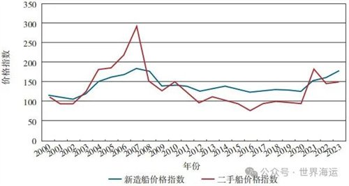 2023年全球造船價格延續(xù)增長勢頭。其中,新船價格年度指數(shù)為178點,同比增長10.2%,已經(jīng)連續(xù)增長三年,接近2008年水平;二手船價格年度指數(shù)為149點,同比小幅增長2%,與2022年基本持平。2000—2023年船舶價格指數(shù)如圖1所示。