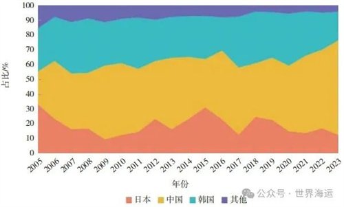 從全球造船競爭格局看,仍以中日韓三國為主,歐洲地區(qū)及越南、菲律賓等其他新興造船國家市場份額較低。以載重噸計,2023年中日韓三國造船完工量之和、新接訂單量之和、手持訂單量之和分別占全球的96.2%、95.8%、94.7%。修正總噸方面,中日韓三國總體占比分別達到全球91.3%、94.5%、88.7%的份額。從細分船型市場份額看,中國在散貨船、油船和汽車運輸船方面表現(xiàn)出絕對的市場掌控力,韓國則在氣體運輸船方面表現(xiàn)最為突出,日本整體市場份額相對較小,其占比最高的散貨船也未達到該船型市場份額的三成。2005—2023年全球市場新船接單量占比如圖2所示。