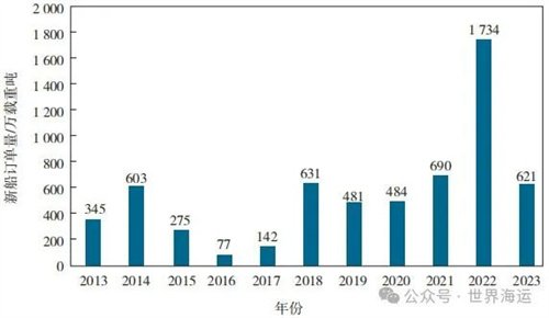 圖3 2013—2023年油船市場新船訂單量變化情況 注:含原油船、成品油船和化學品油船。