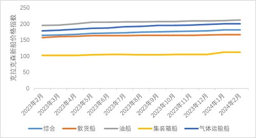 截至2024年2月,克拉克森新船價格指數(shù)收于181點,環(huán)比上漲0.1%,同比上漲10.7%。從主力船型看,散貨船、油船、集裝箱船和氣體運輸船的克拉克森新船價格指數(shù)分別為166點、211點、112點和200點;總體來看,散貨船、集裝箱船和氣體運輸船價格基本保持穩(wěn)定,油船價格上漲相對明顯,漲幅為0.7%;所有船型均實現(xiàn)同比上漲,散貨船、油船、集裝箱船和氣體運輸船的新船價格漲幅分別為5.5%、8.2%、10.2%和12.2%。從典型船型看,17.4萬立方米LNG運輸船和VLCC新船價格保持穩(wěn)定,分別為2.65億美元和1.28億美元,2.3萬TEU箱船新船價格上漲,達到2.645億美元。