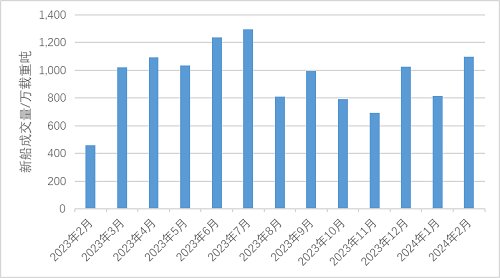 2月,全球成交新船訂單111艘1096萬載重噸,同比分別上漲79.0%和137.7%,環(huán)比分別下降15.9%和上漲34.5%。全球船舶完工交付79艘459萬載重噸,同比分別下降18.6%和9.8%。2月末,全球船舶手持訂單4594艘2.72億載重噸,同比分別上漲2.2%和10.6%。
